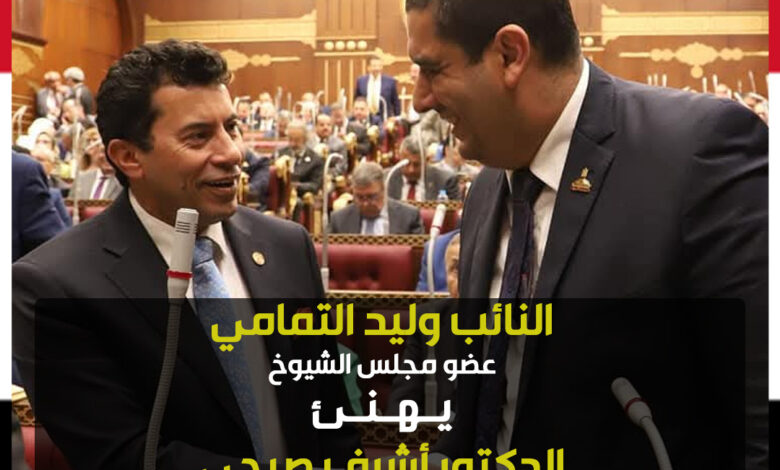 هنأ النائب وليد التمامي عضومجلس الشيوخ الوزير الدكتور اشرف صبحي وزيرالشباب والرياضة بمناسبة اختيار مصر لسيادته لرئاسة التربية البدنية والرياضية باليونسكو وجاء نص التهنئة كالآتي: أتقدم بخالص التهاني بمناسبة هذا الإنجاز العظيم والنجاح الباهر. لعملكم الدؤوب وتفانيكم جعلكُم مثالاً يُحتذى به اهنيء معالي الوزير الدكتور اشرف صبحي وزير الشباب والرياضة علي ترشيح مصر له لرئاسة اللجنة الحكومية الدولية للتربية البدنية والرياضة باليونسكو ألف مبروك، ونتمنى لكم مزيداً من التوفيق والتميز.”